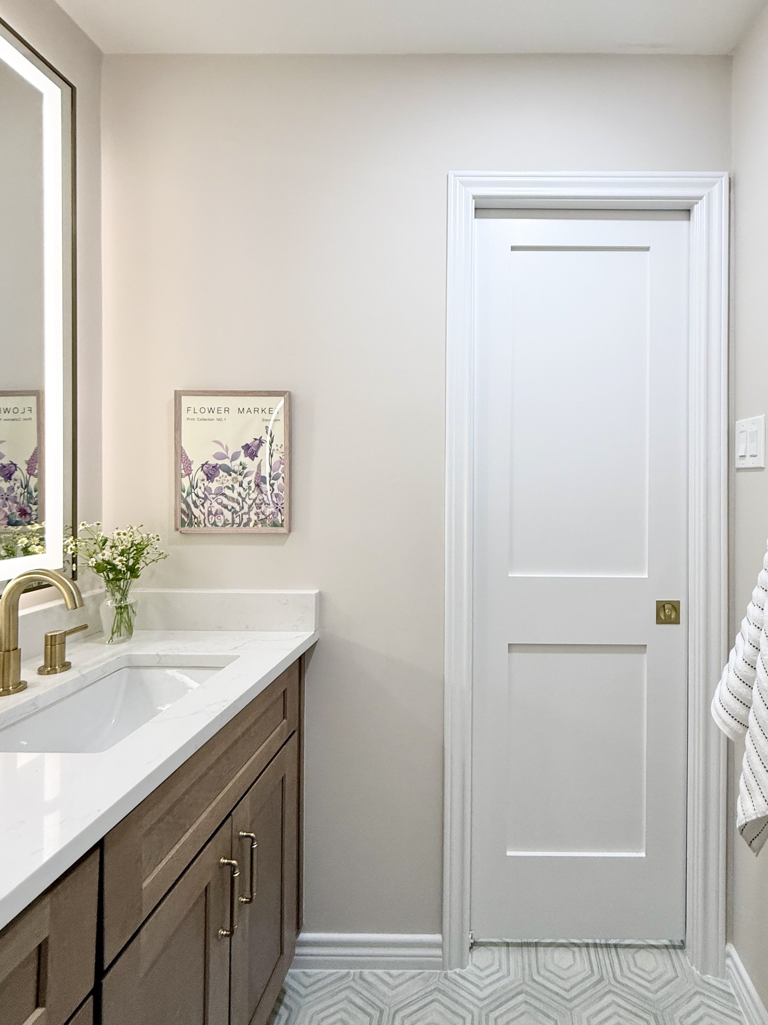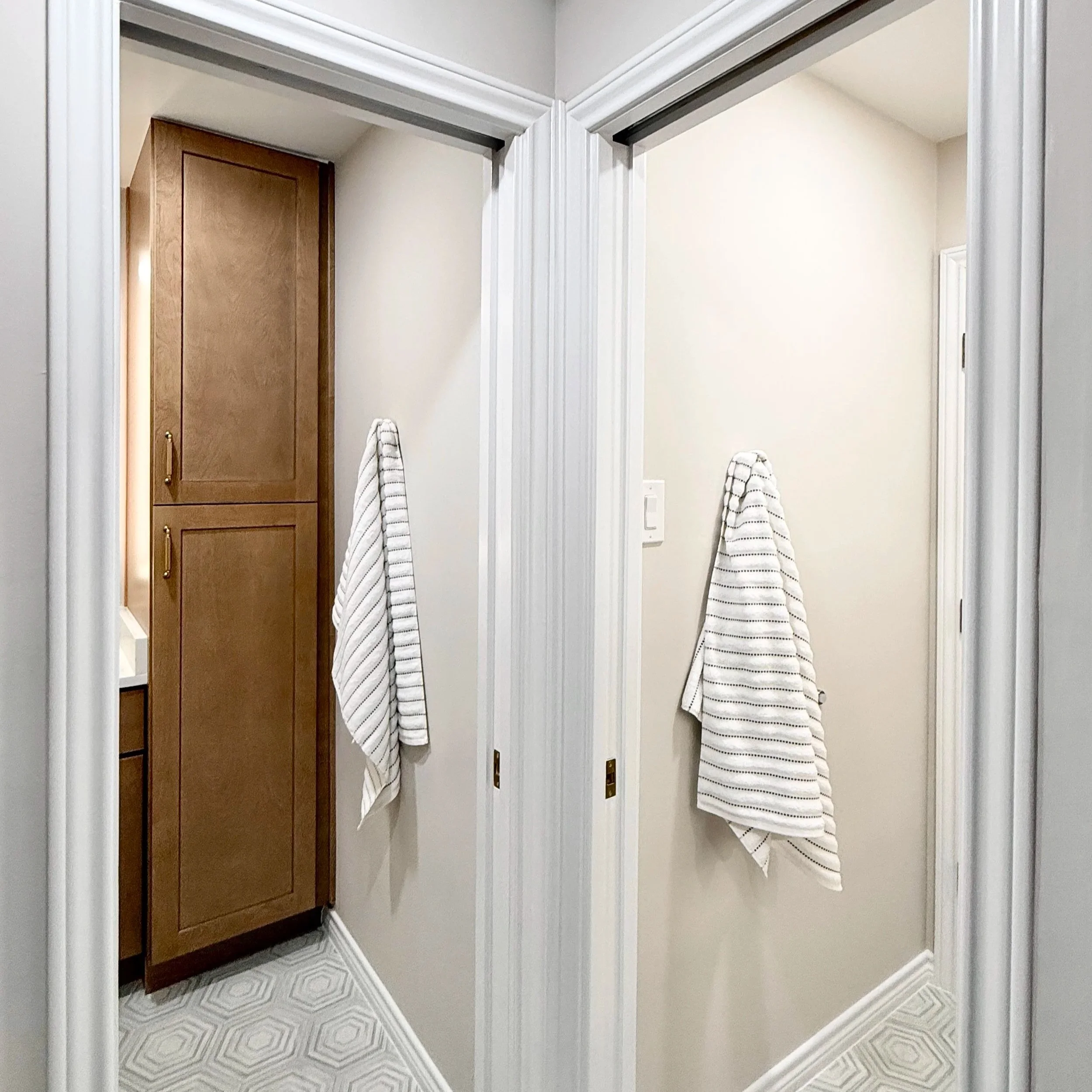 Our team redesigned the layout to incorporate pocket doors, eliminating door collisions and instantly improving flow while adding functional wall space—finally allowing for towel hooks and everyday storage where it’s actually needed.