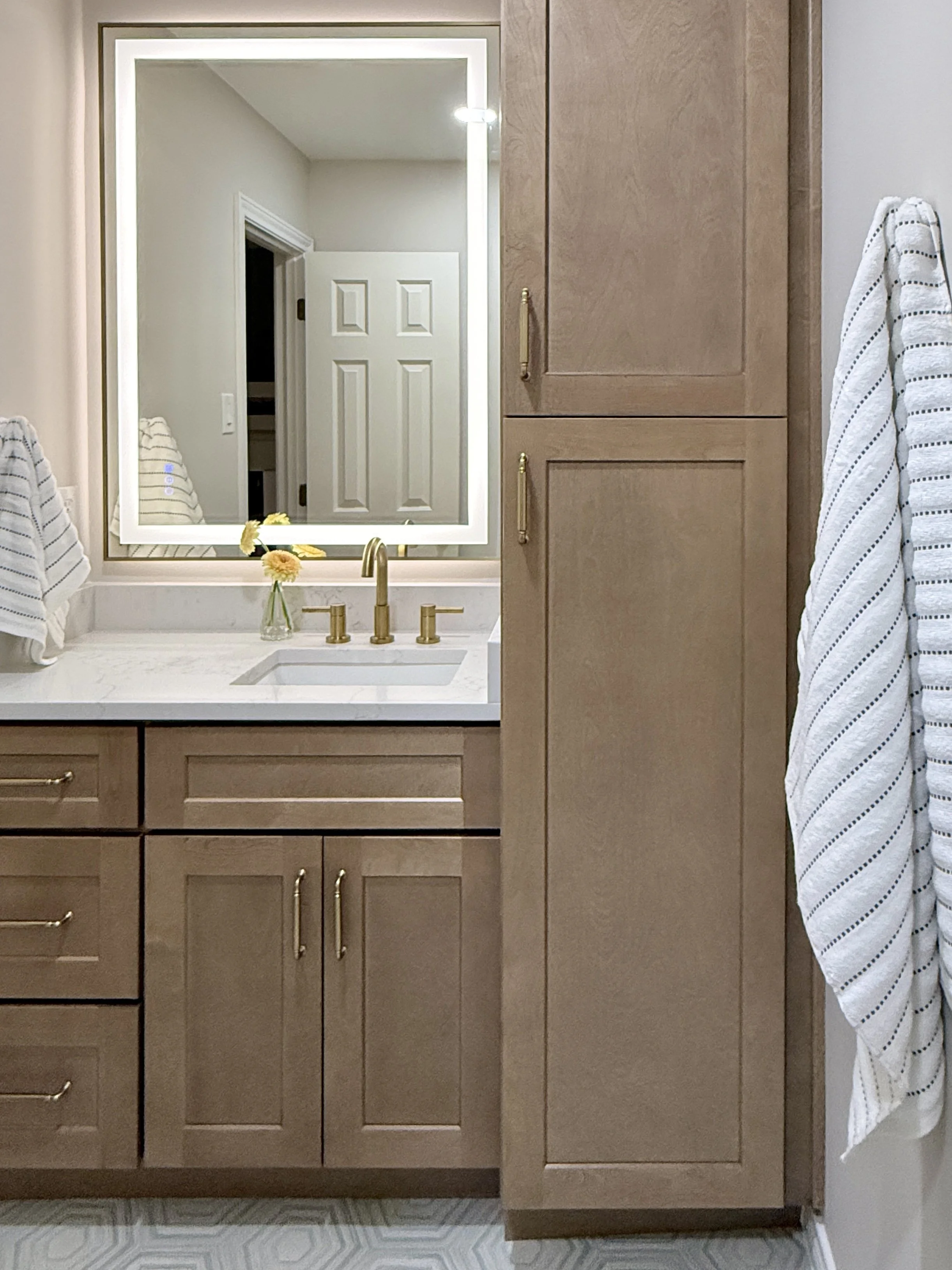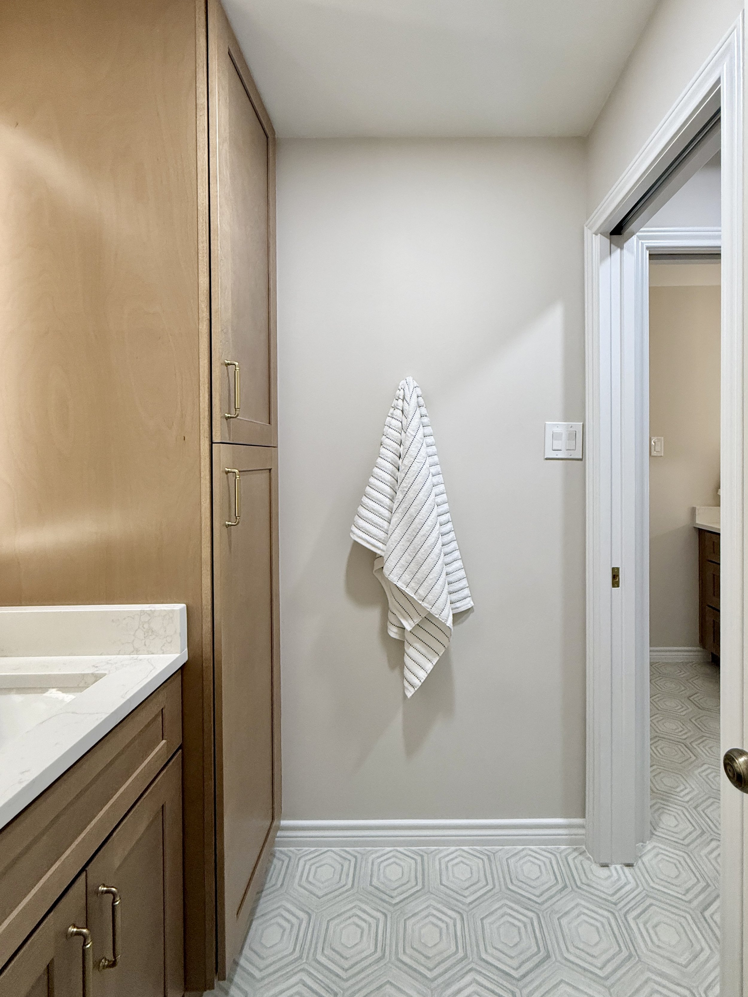 By removing an outdated hot water heater closet, we were able to add a generous linen cabinet that now holds towels, makeup, hair tools, and more—keeping the space organized and clutter-free.