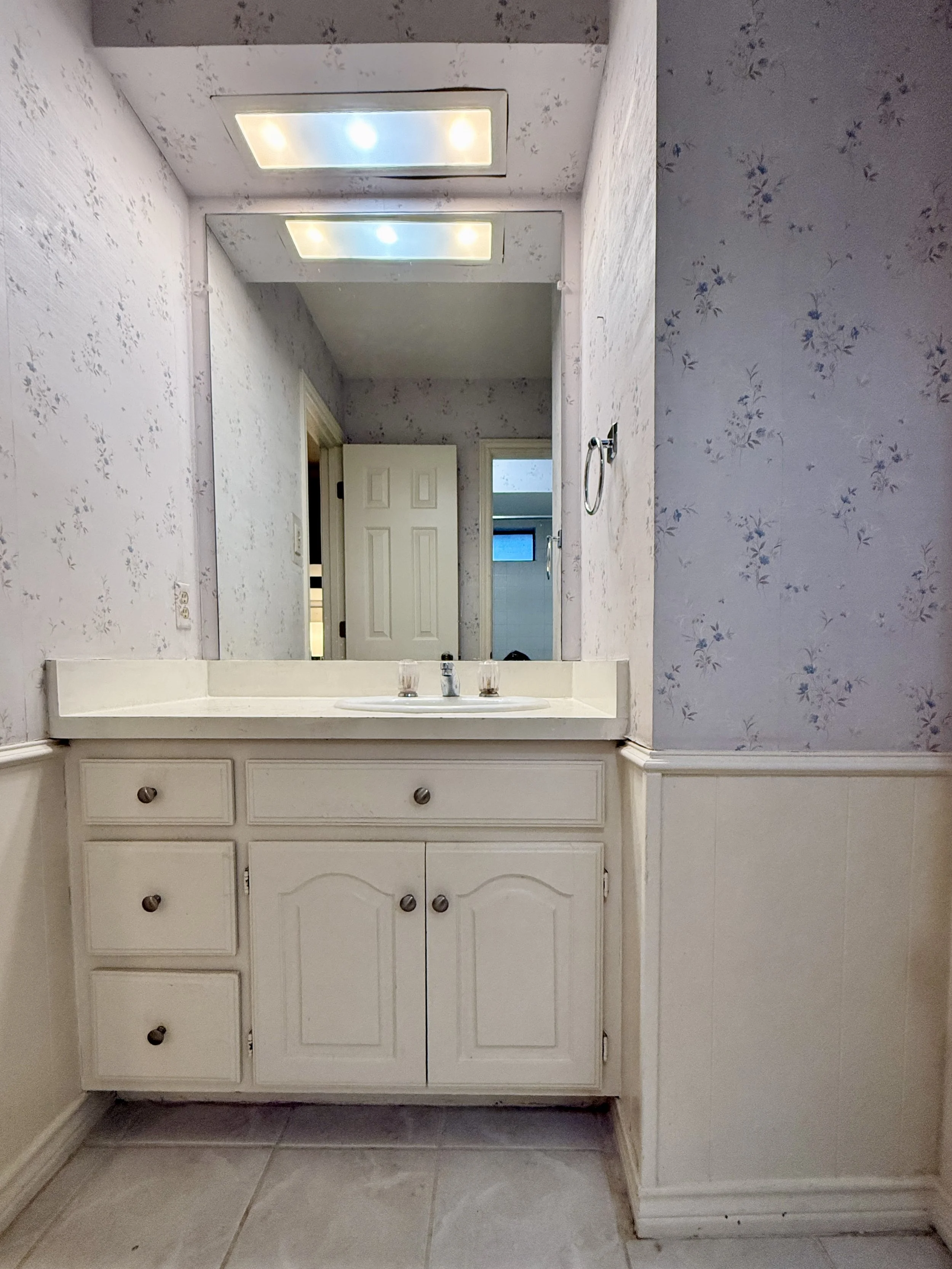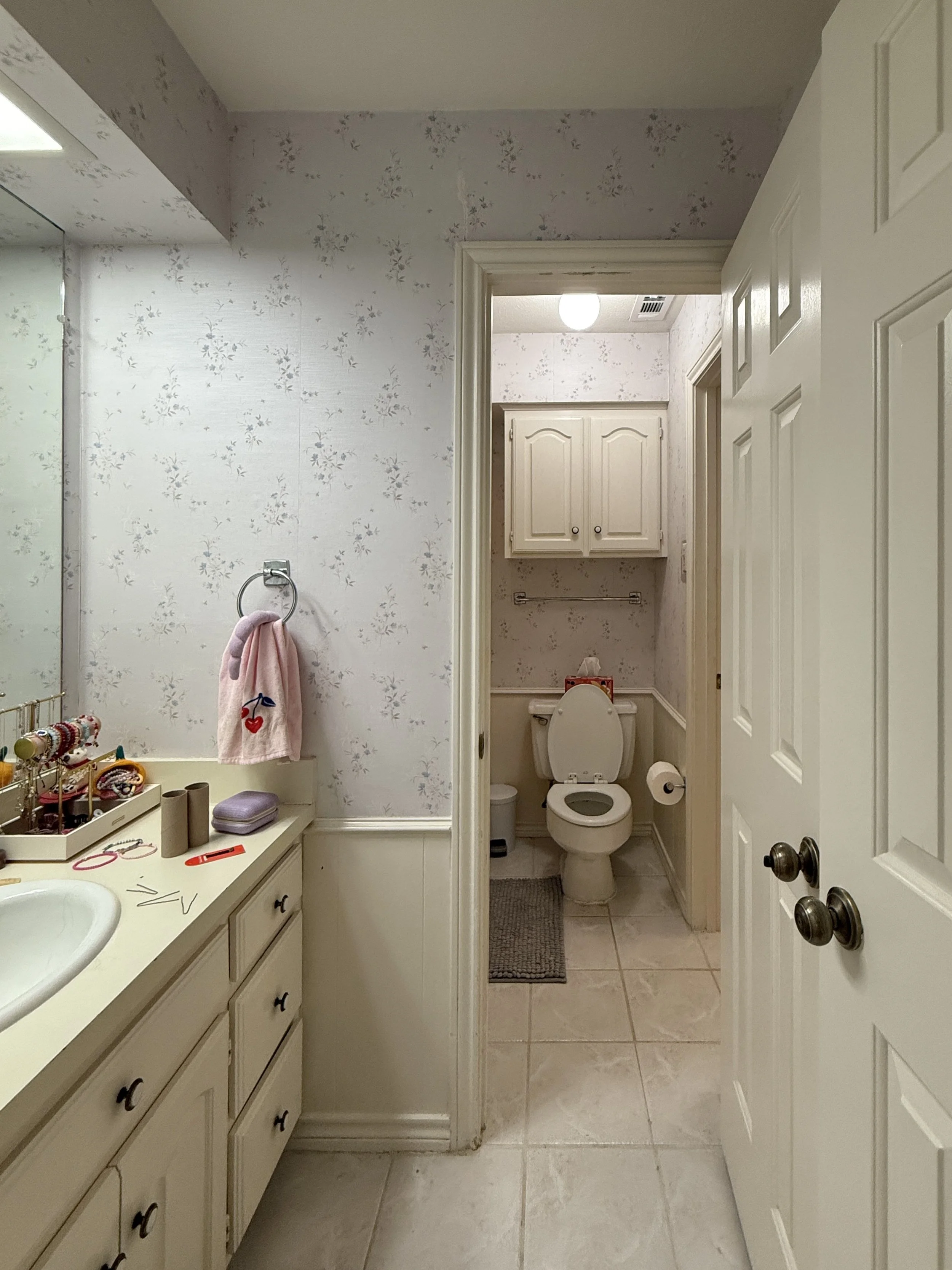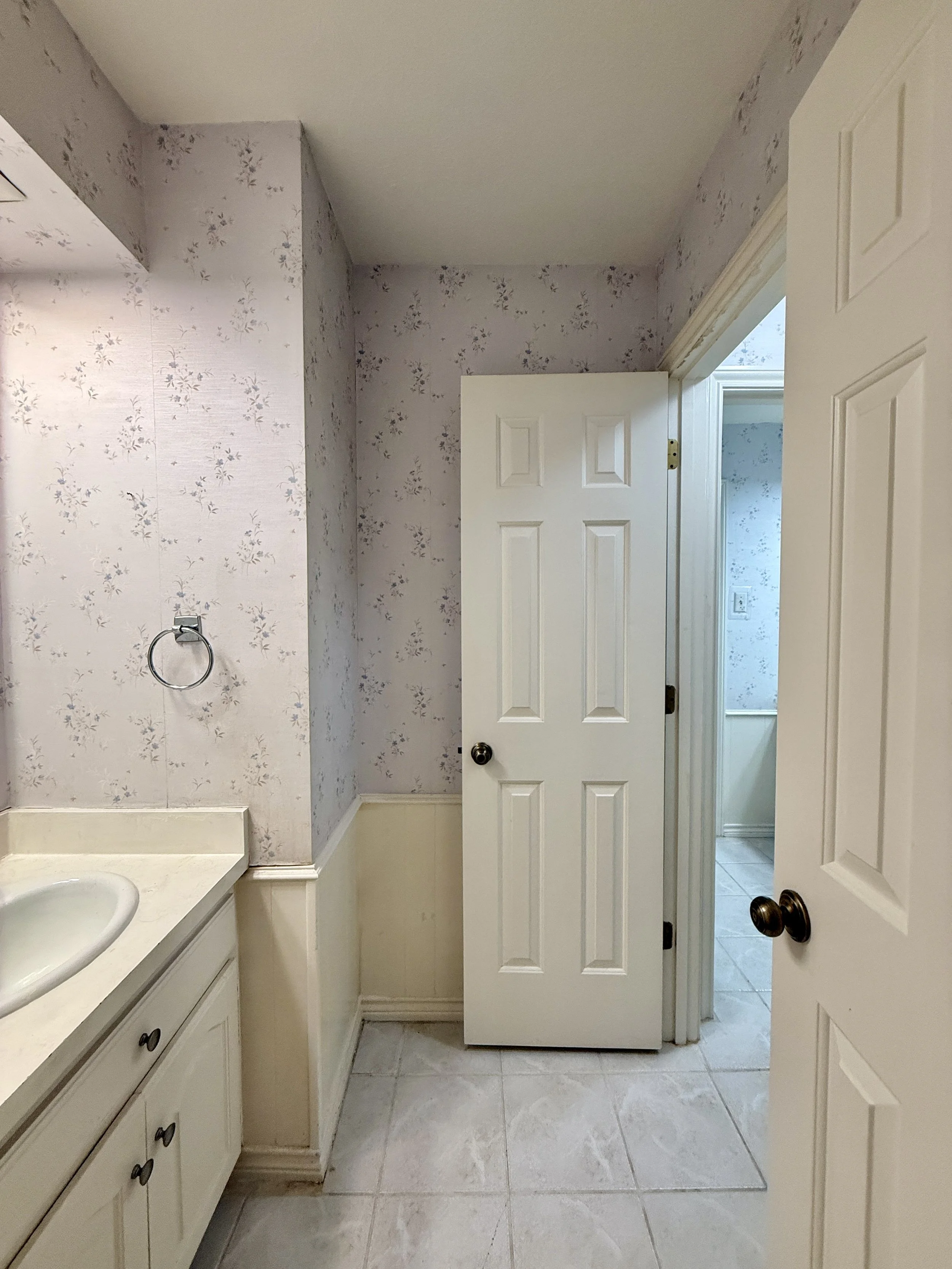 We removed outdated wallpaper and replaced with fresh new texture and Egret White paint from Sherwin Williams. We introduced a modern tub/shower combination designed for durability and easy maintenance, paired with updated finishes that feel fresh yet timeless.
